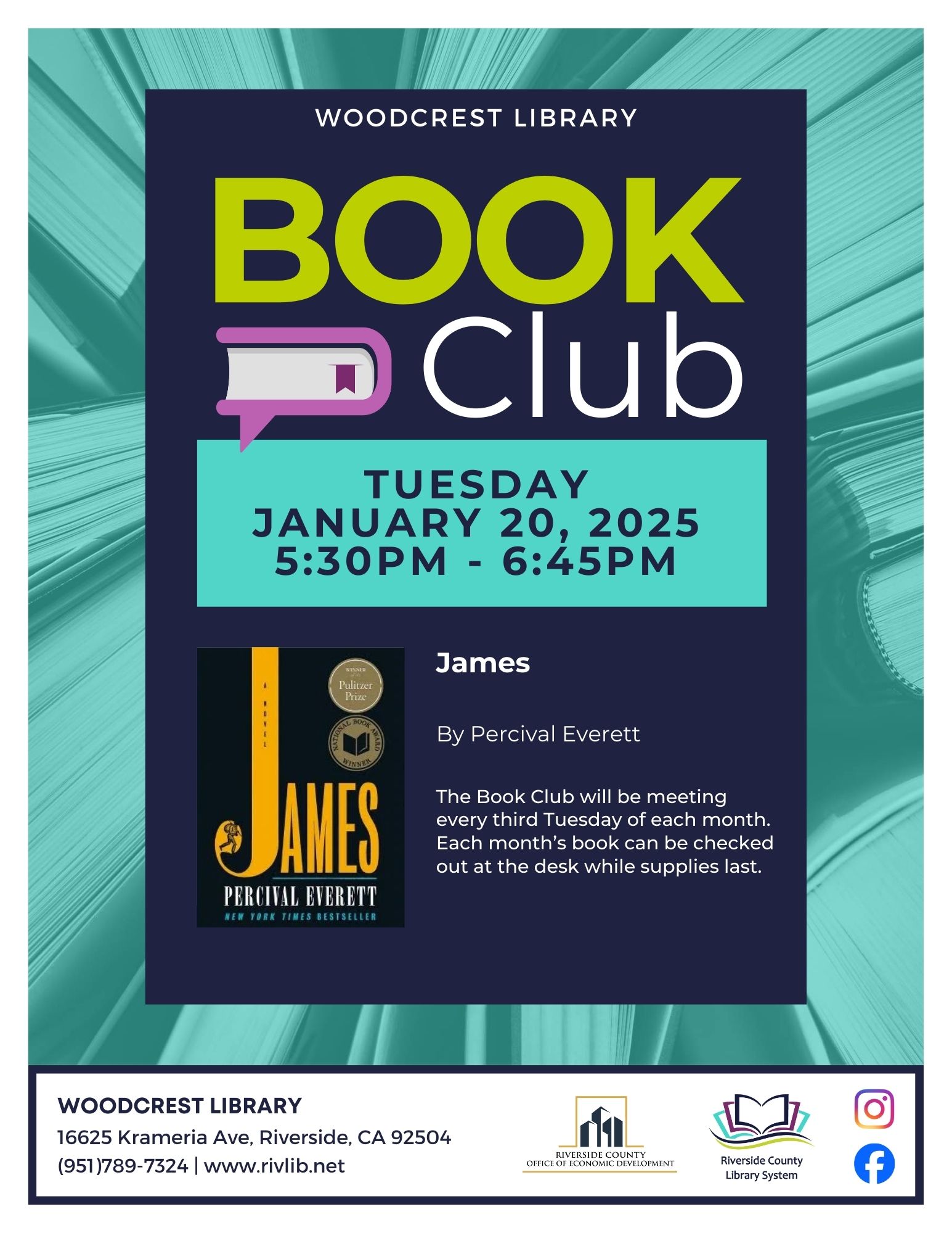 Come join the monthly book club discussion! This month's book is "James," by Percival Everett.
